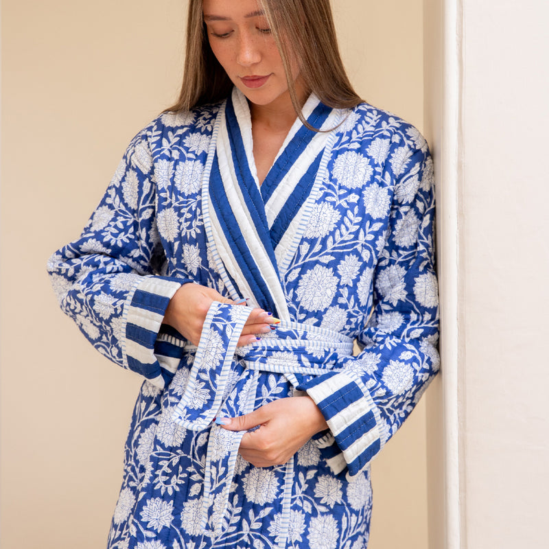 Made from soft, breathable cotton, the ZINAT Blue quilted dressing gown is perfect for lounging, slow mornings and evenings at home...