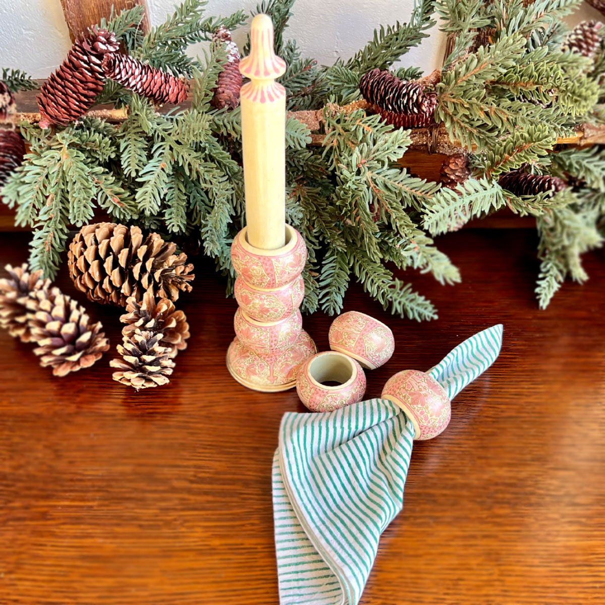 Our limited edition Christmas collection from Kashmir includes festive papier-mâché hand painted candle sticks, trinket boxes, baubles and napkin rings depicting exotic flora from the Kashmir Valley in jewel colours and flecks of gold.