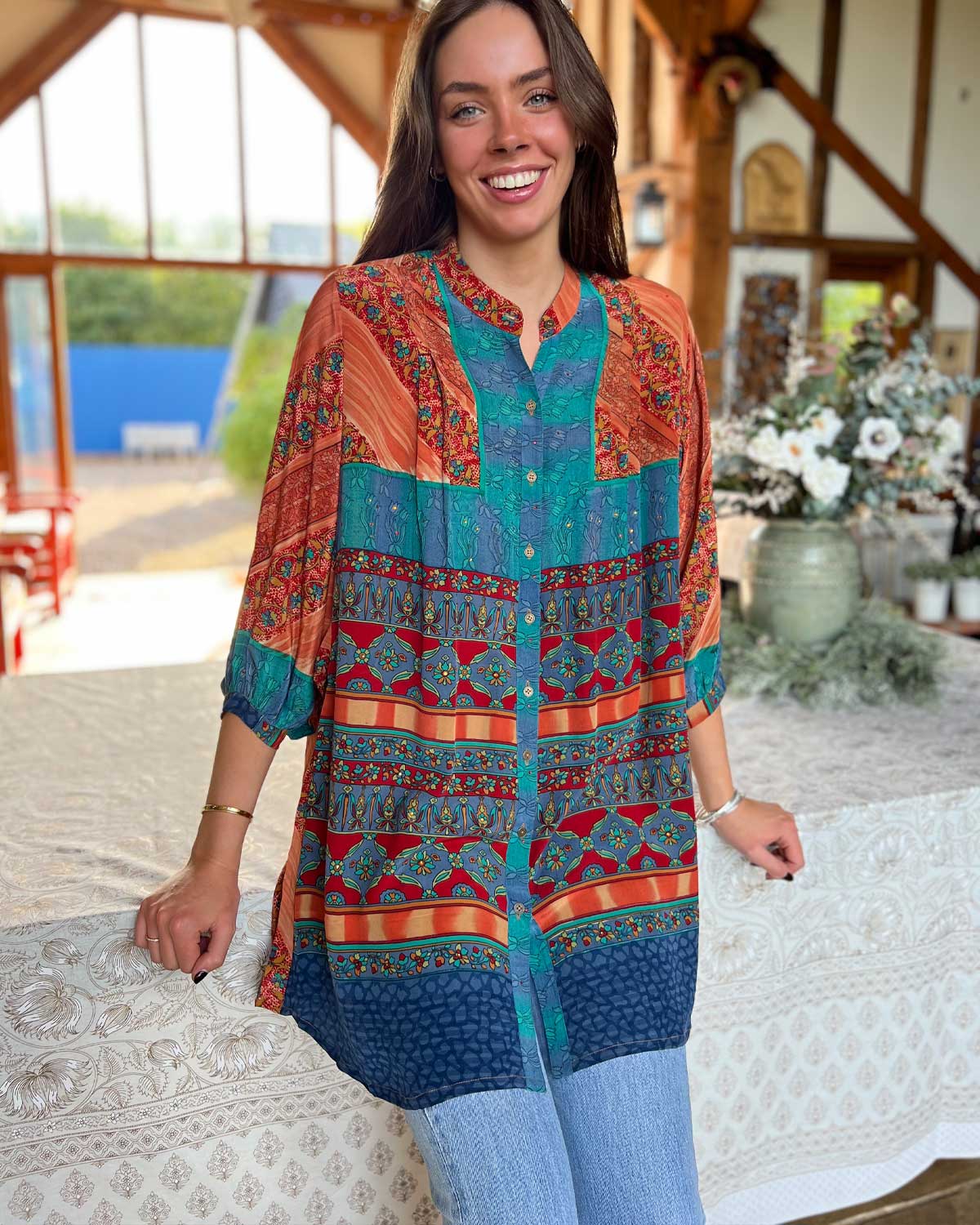 Up your lounge wear quotient and wrap yourself in our luxurious shirt dresses upcycled from fine vintage crepe silk sarees. Feminine, chic and sensual, our silk shirt dresses will take you from day to evening at home or on holiday.