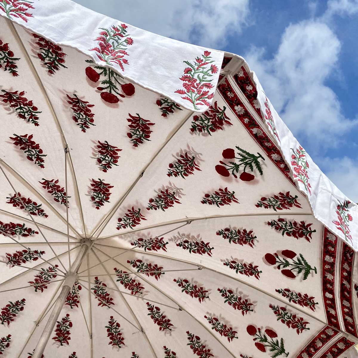 Available in a variety of enticing colours and blockprints to spruce up your garden, terrace or a carry along to the beach. This gorgeous double layered beauty is embellished with prints on either side and finished with a decorative valance. Comprises of a two part stainless steel pole with an adjustable tilt mechanism for better coverage. With a wooden topper and carrier bag.