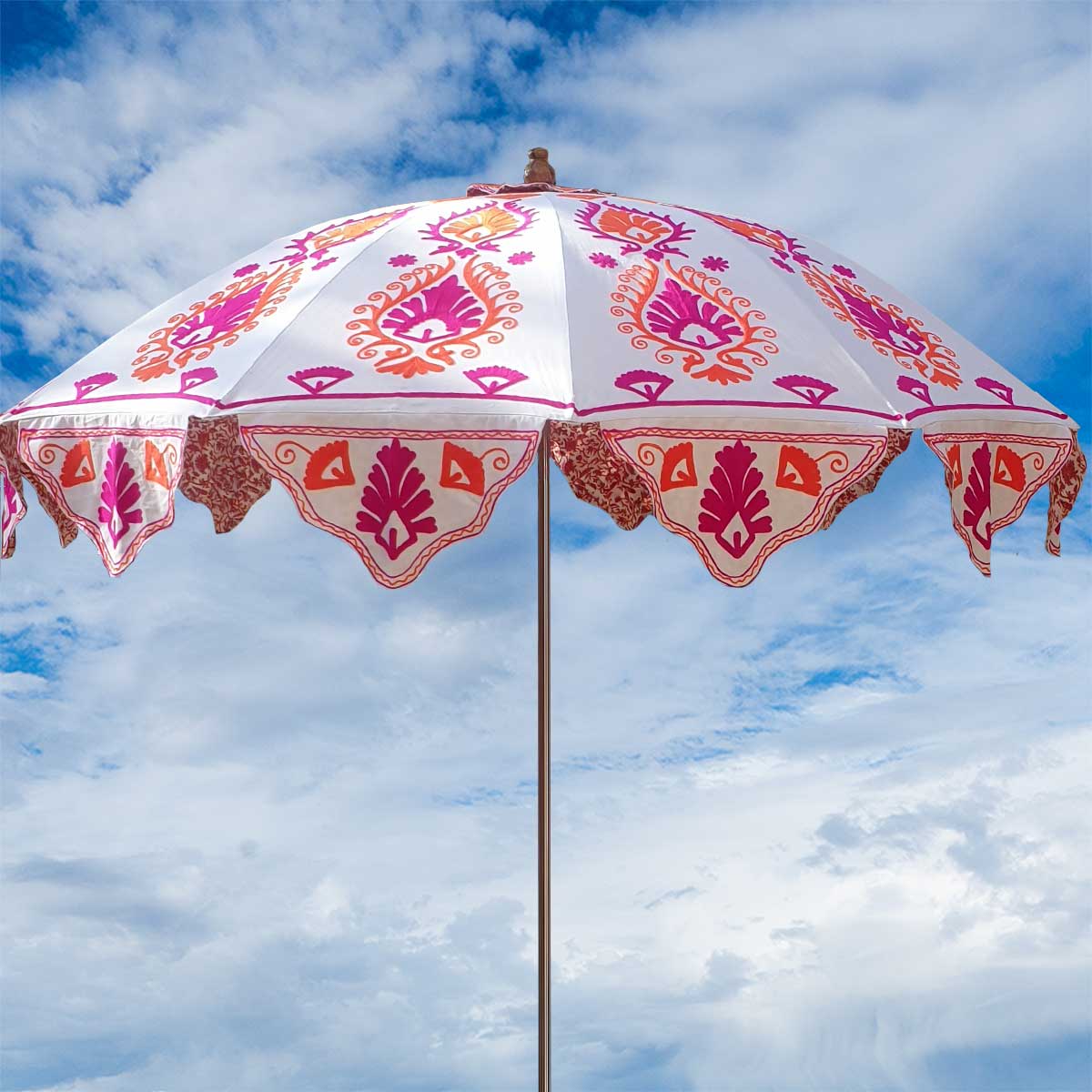 Introducing the exuberant RANI SUZANI! A double layered beauty, embellished with crewel embroidery and blockprint on either side and finished with a decorative valance. With a wooden topper and carrier bag. Adjustable height mechanism as required.
