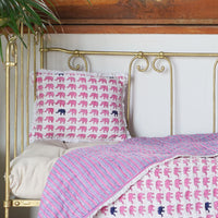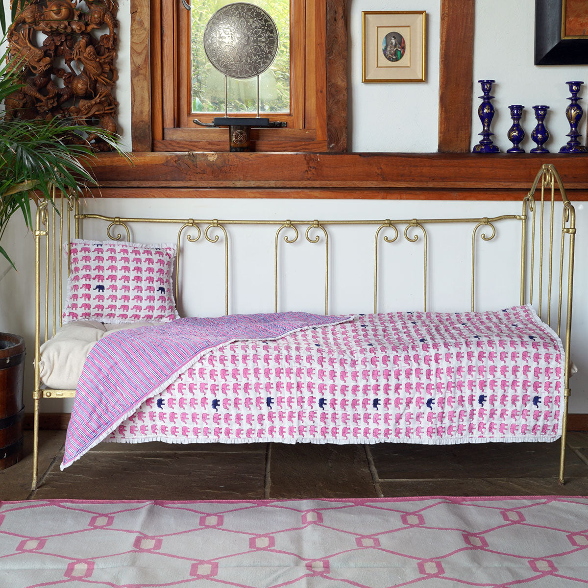 Featuring our super soft cotton junior quilts adorned with playful blockprint motifs in bright, cheerful colours. Reversible with soft cotton padding for added comfort, finished with rows of kantha hand stitches.