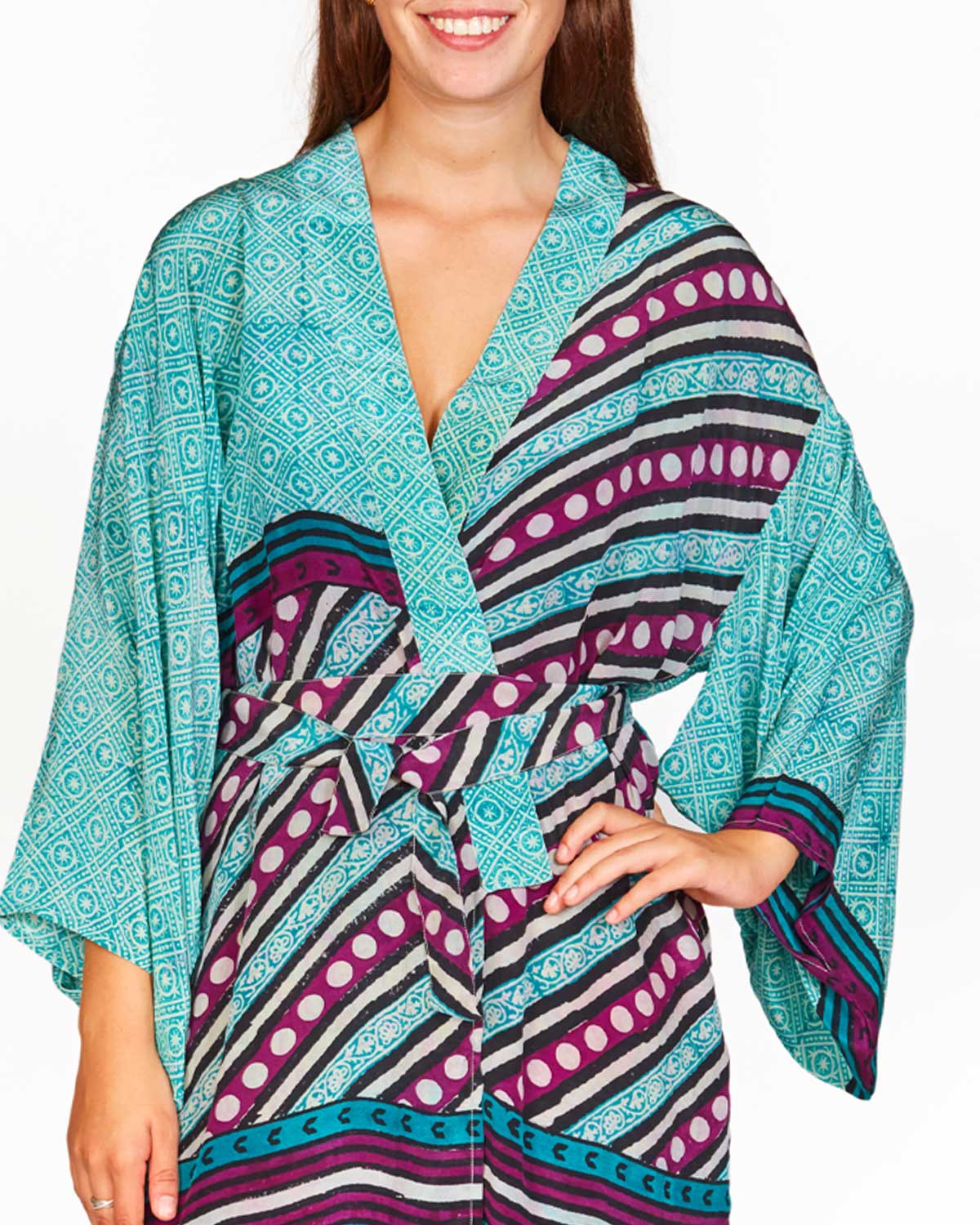 Up your lounge wear quotient and wrap yourself in our luxurious kimonos upcycled from fine vintage crepe silk sarees. A layer of decadent silk that can be worn as a dressing gown or a swimsuit cover-up and defines comfort chic at best. Each kimono features an interplay of patterns cut from different sections of a saree, making each creation truly unique.