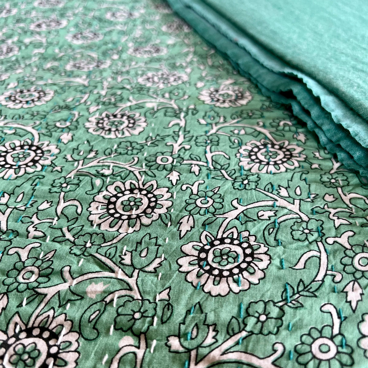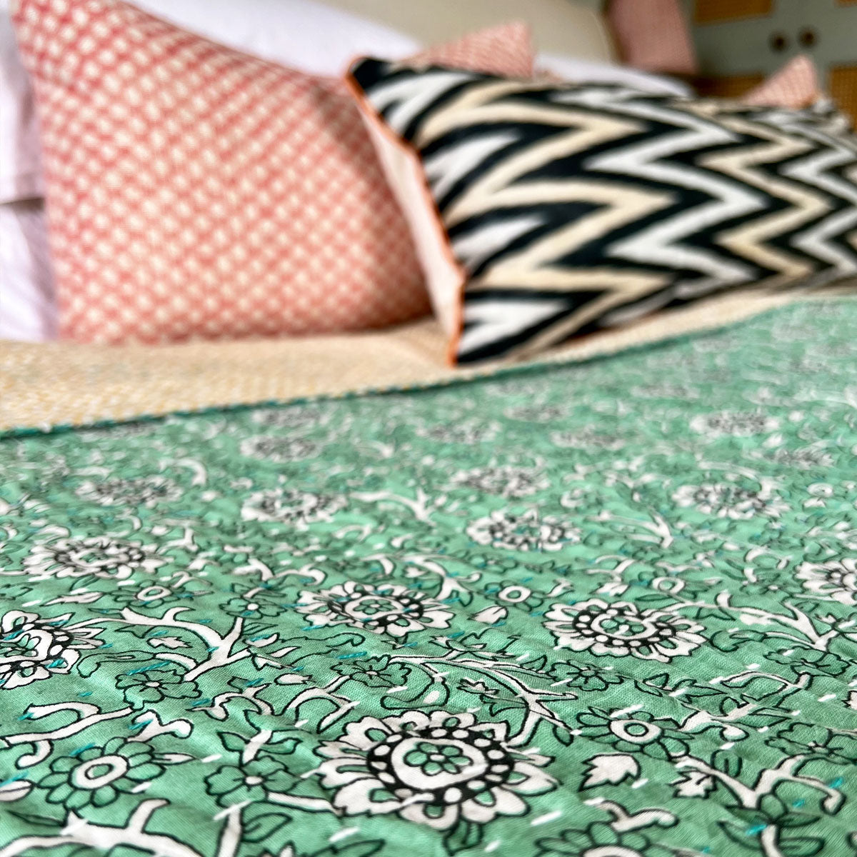 Our vibrant RIO kantha quilt is the perfect accessory to introduce colour and texture into your room instantly. Soft voile cotton embellished with contrast blockprints on either side, finished with scores of hand stitches in signature kantha style. Crafted by artisans in India.