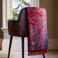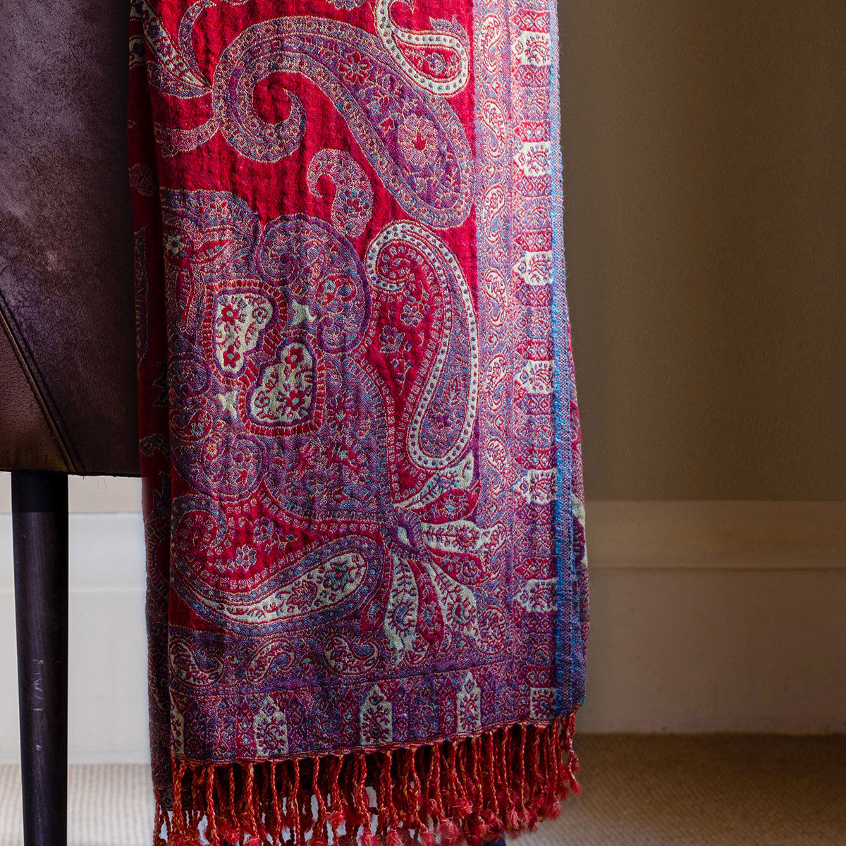 Rich, warm hues embellished with an intricate pattern, the Jamevar throw imparts a distinct character to your living space. Use them to brighten a faded armchair, add colour and texture to a bed or as a vibrant shawl on a cold day. Woven with a double weft technique thus creating a different colourway on the reverse and finished with a tassled edging.