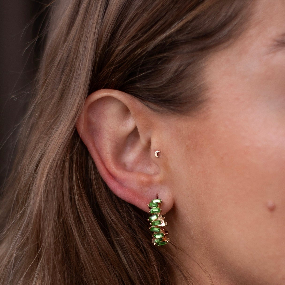 Sitara earrings feature baguette cut stones set in a gold open hoop. Perfect for elevating everyday outfits or adding an artistic touch to special occasions.