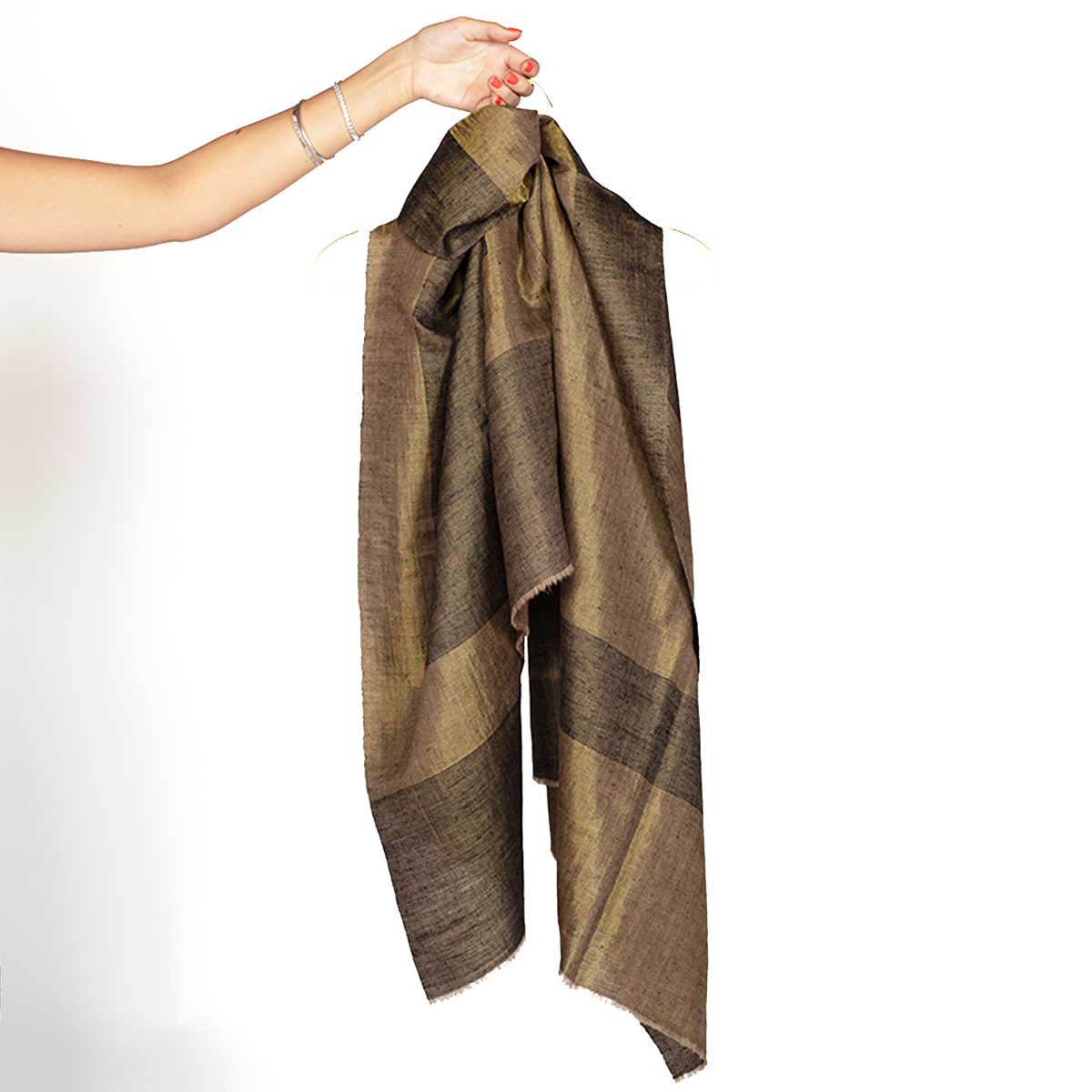 This opulent crafted shawl, expertly woven from the finest cashmere wool sourced from the Ladakh region in the Himalayas, features a lightweight yet snug feel. Radiant metallic yarn woven into the reverse, set against the contrast of the natural base, ensures you exude effortless style...